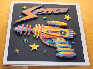 Olen joskus aikaa sitten ostanut Kruununjalokivestä tällaisia K&Companyn 3D-avaruustarroja. Nyt iski halua siivota tarvikkeita ja sillä vimmalla, tadaa, kaksi korttia kymmenessä minuutissa. En oikein tiedä, kehtaako näitä sanoa itse tehdyiksi, oma luovuus ei tässä liiemmin kukkimaan päässyt, mutta kortteja on nyt joka tapauksessa kaksin kappalein jollekulle avaruusintoiselle pikkuihmiselle. Tai aikuiselle, mistäs sitä tietää. =)