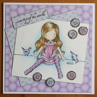 Alkukesästä onni potki oikein leveästi virnistellen, sillä voitin kahdessa hienossa arvonnassa bloginamun. Tämä Gorjuss-tyttönen tuli yhden toisen upean leimasimen kera Korttikarkurin arvonnasta. Elokuulle meni, ennen kuin sain siitä kortin tehtyä. Gorjussit eivät ole koskaan tuntuneet omalta jutultani, mutta niin vaan oli kiva tätä tyttöä väritellä. Teksti ja napit ovat samasta leimasinsetistä, paperit Maja Designin Ska vi ta en fika?-kokoelmasta.