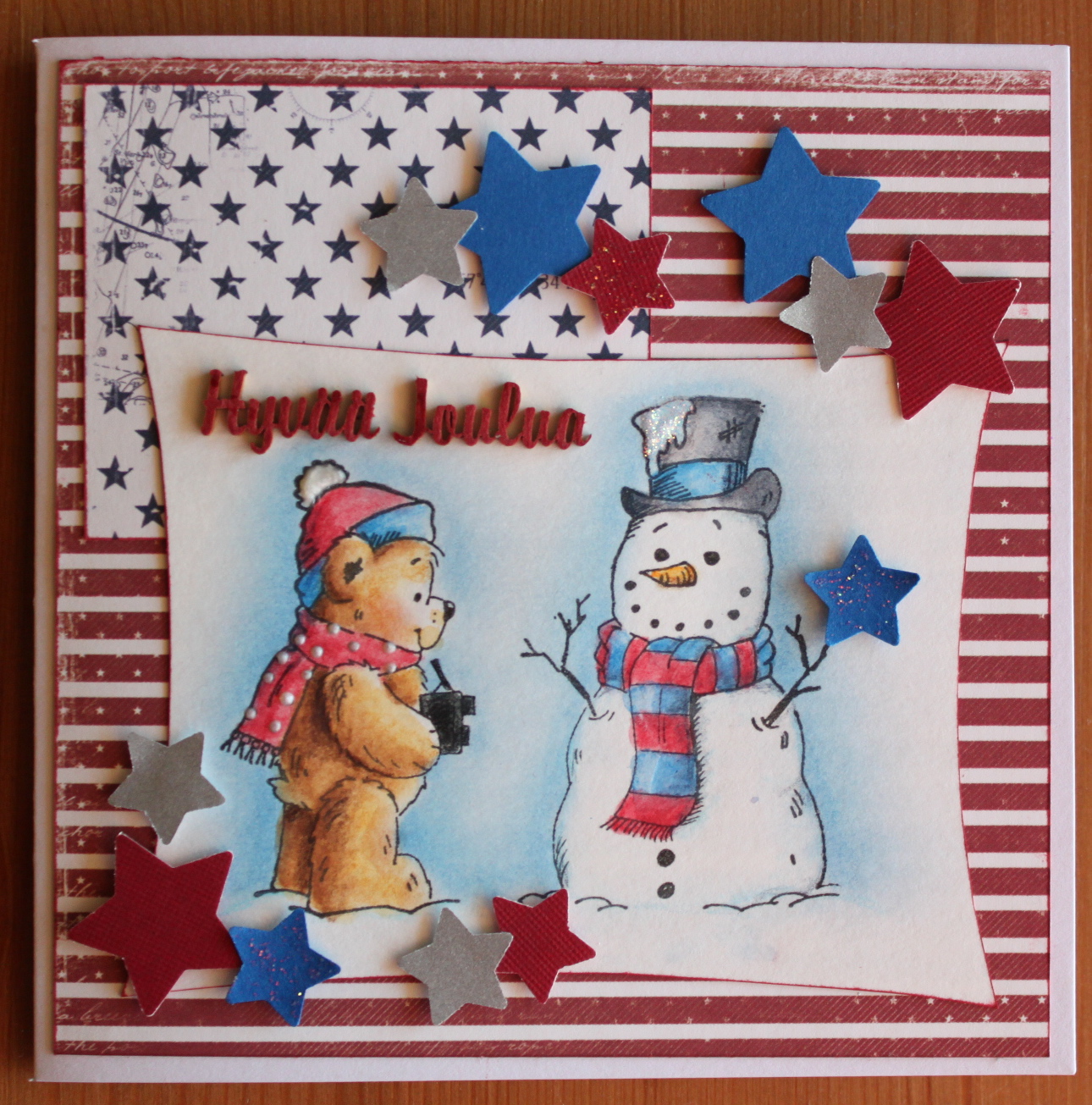 Leimasin tai oikeastaan leimasimet ovat Penny Blackin akryylisetistä, paperit Maja Designin, tähdet runtattu kahdella eri leikkurilla ja kohotettu tarroilla.