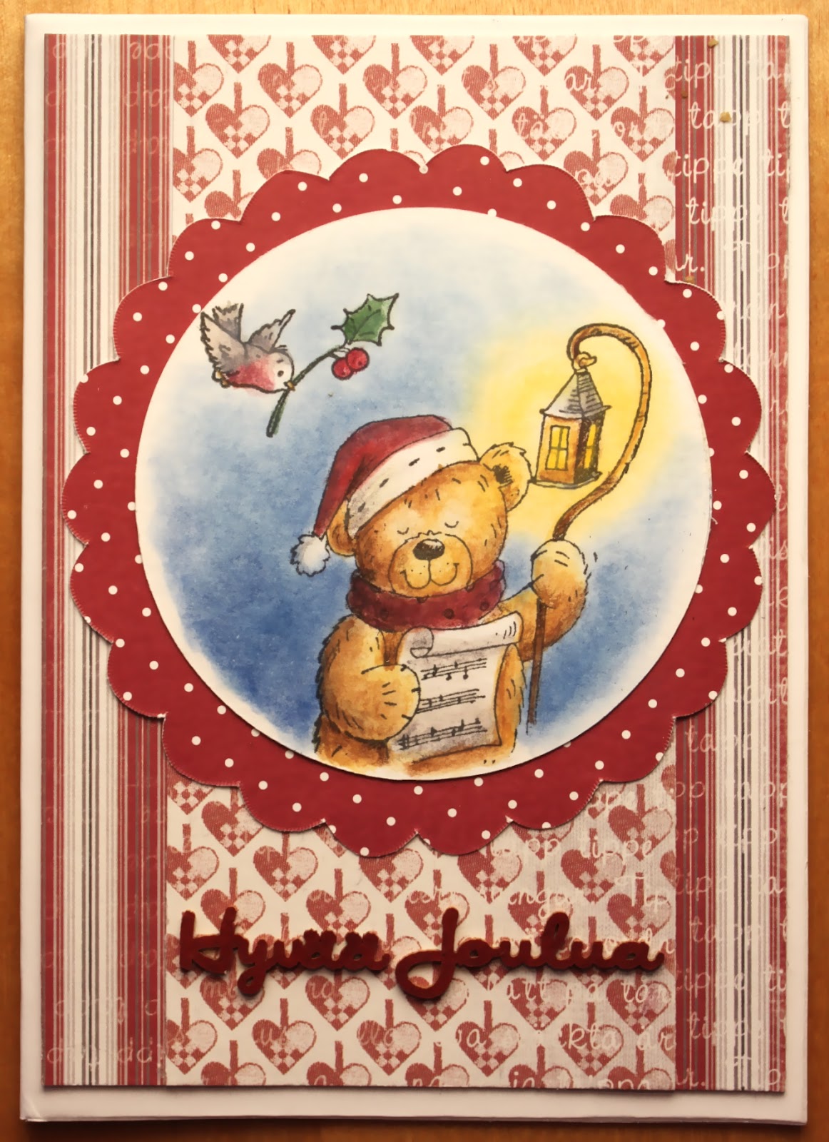 Nyt ajattelin, että johan on kumma. Aloin väritellä näitä Penny Blackin karhuja ja kyllä niistä vaan kortit syntyi. Olen tosi iloinen, kun sain pitkällisen "projektin" näin päätökseen. =)